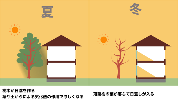 また、植える樹木を落葉樹にすると、夏は葉が生い茂ることで、部屋に入り込む日射を遮ります。冬は葉を落とすので、冬場の部屋に入り込む日射は確保できます。